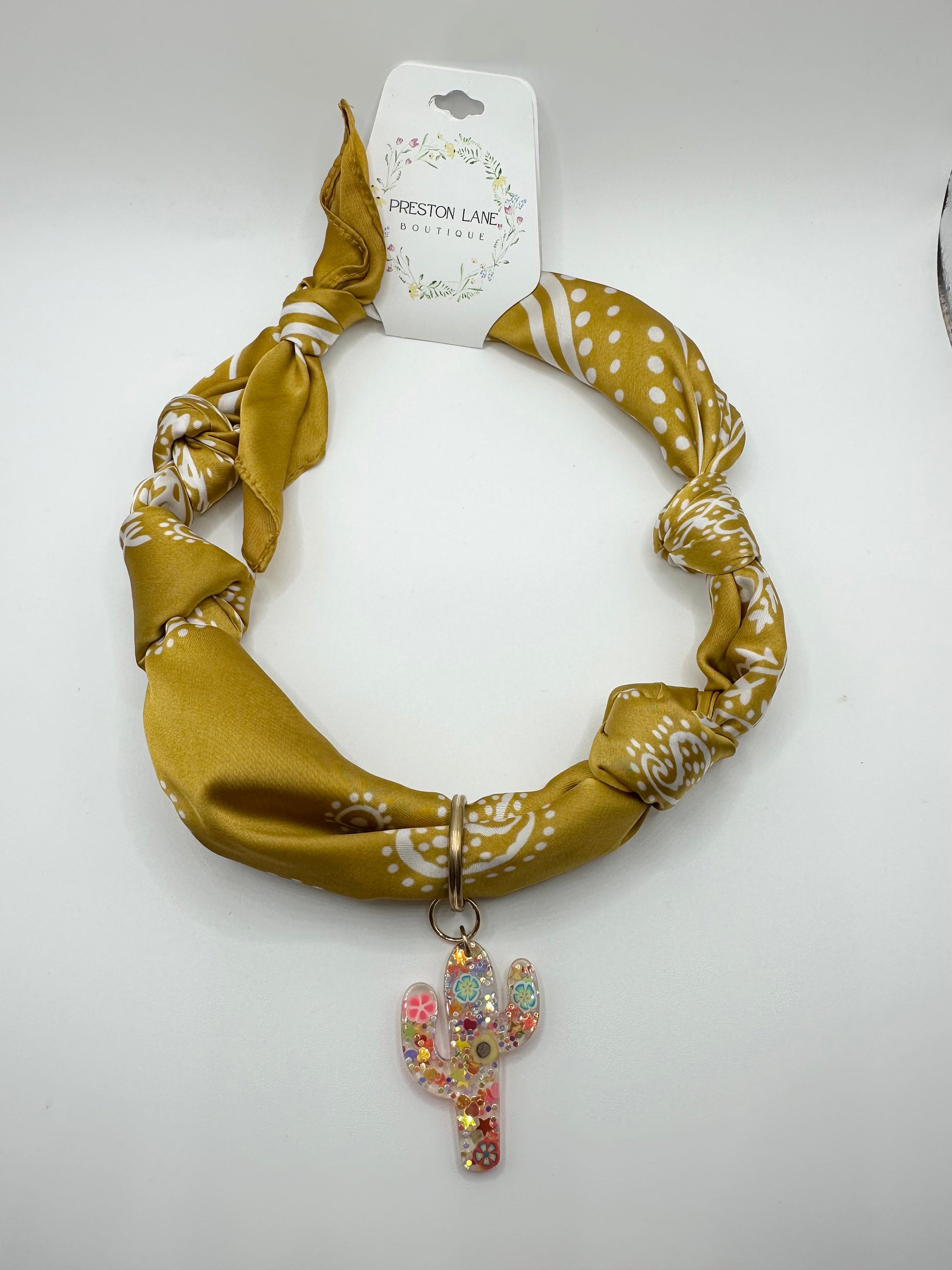 Available in black with beaded cactus charm, red and blue with gold locket charm, pink cheetah print with gold bow charm, red with gold lock charm, gold with acrylic cactus charm.