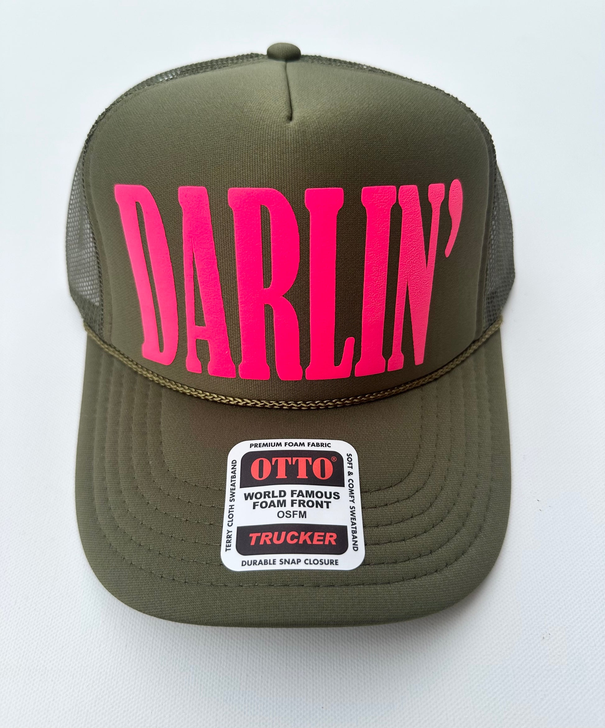 3D puff vinyl Darlin neon pink on a olive foam trucker hat
