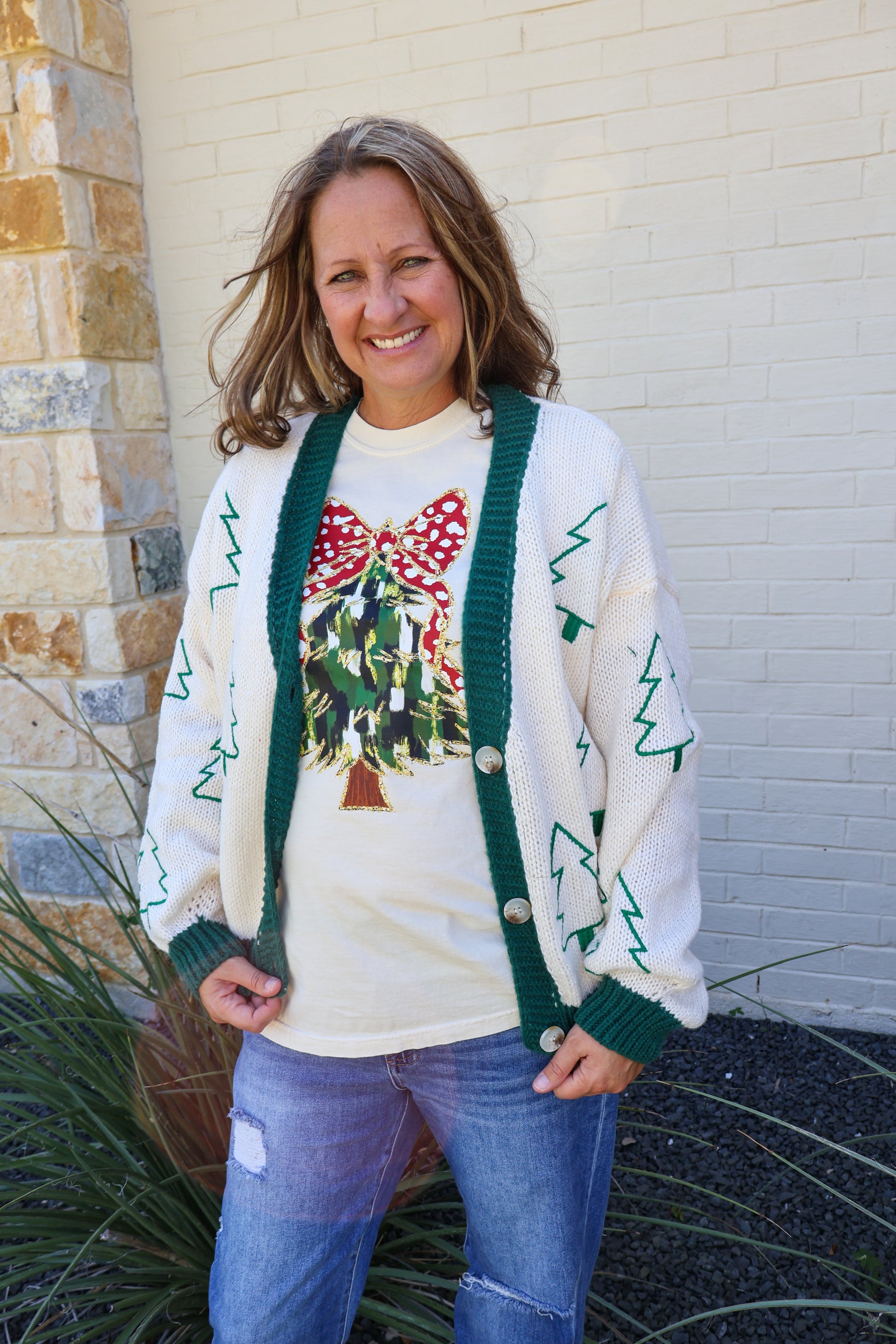 Celebrate the season with the Paint Tree tee, featuring a charming paint stroke Christmas tree topped with a festive red bow. This ivory graphic tee combines holiday spirit with casual comfort, making it perfect for cozy winter days and festive gatherings.