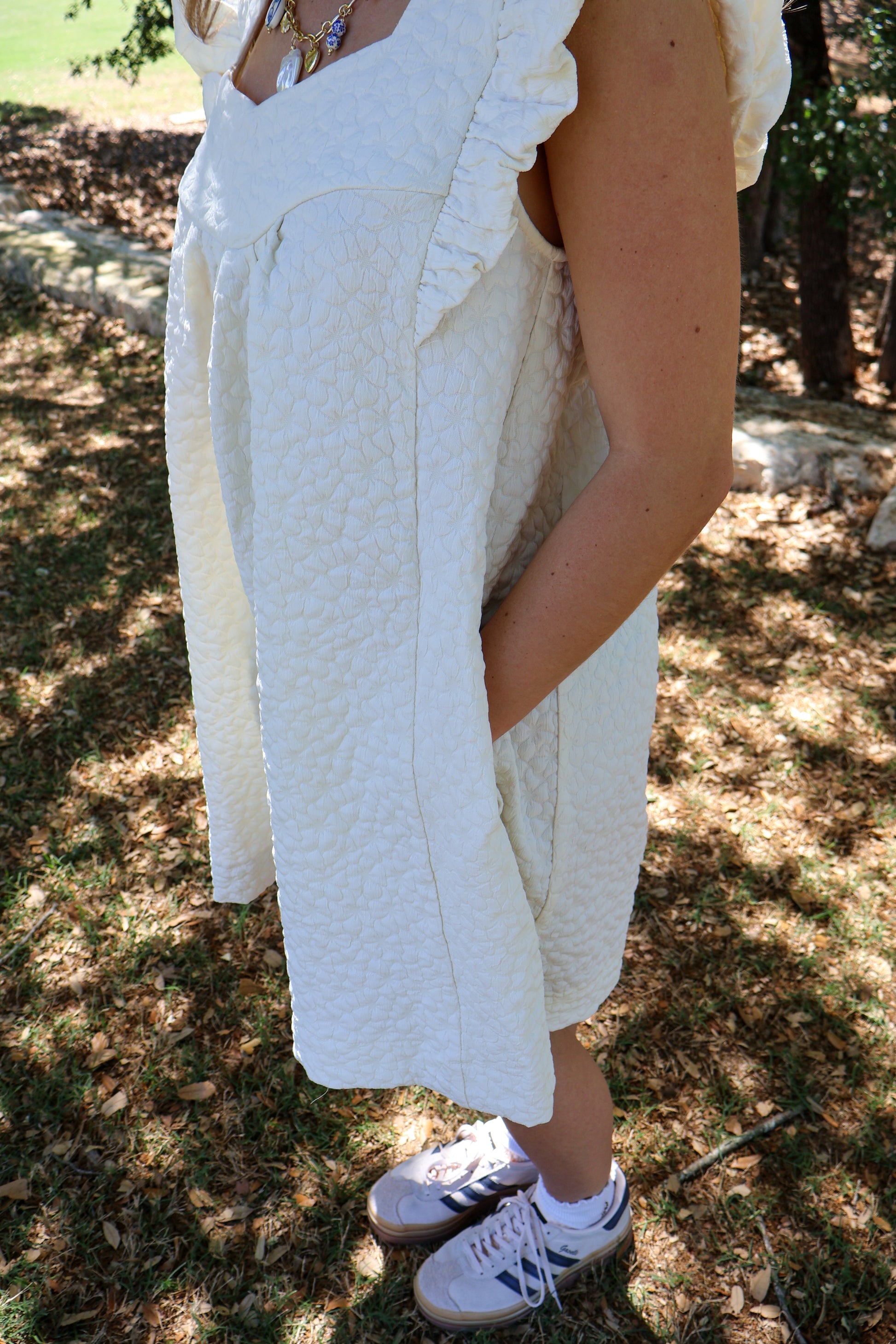 Ivory cap sleeved textured woven dress