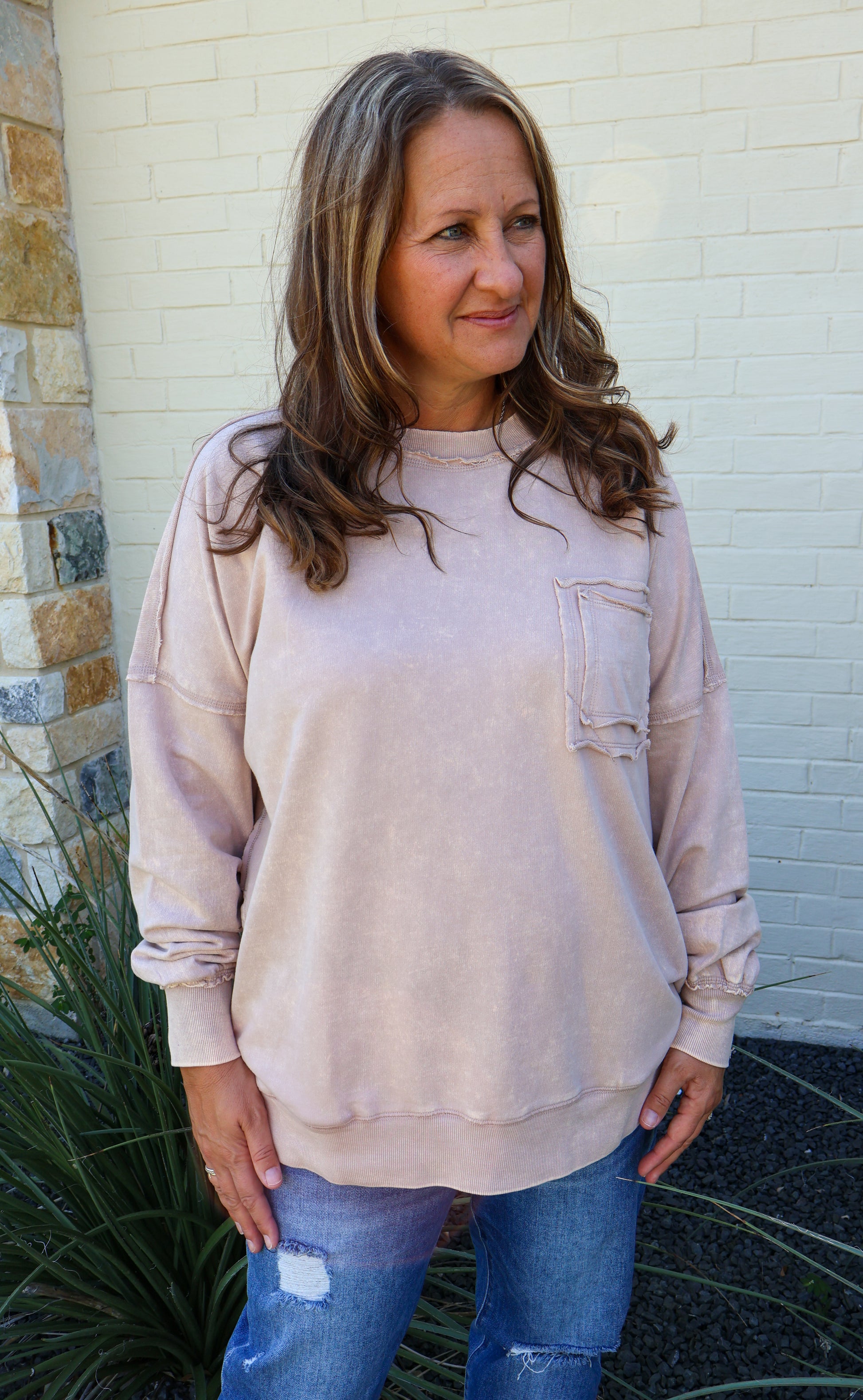 Ash mocha colored terry cloth top with front pocket detail