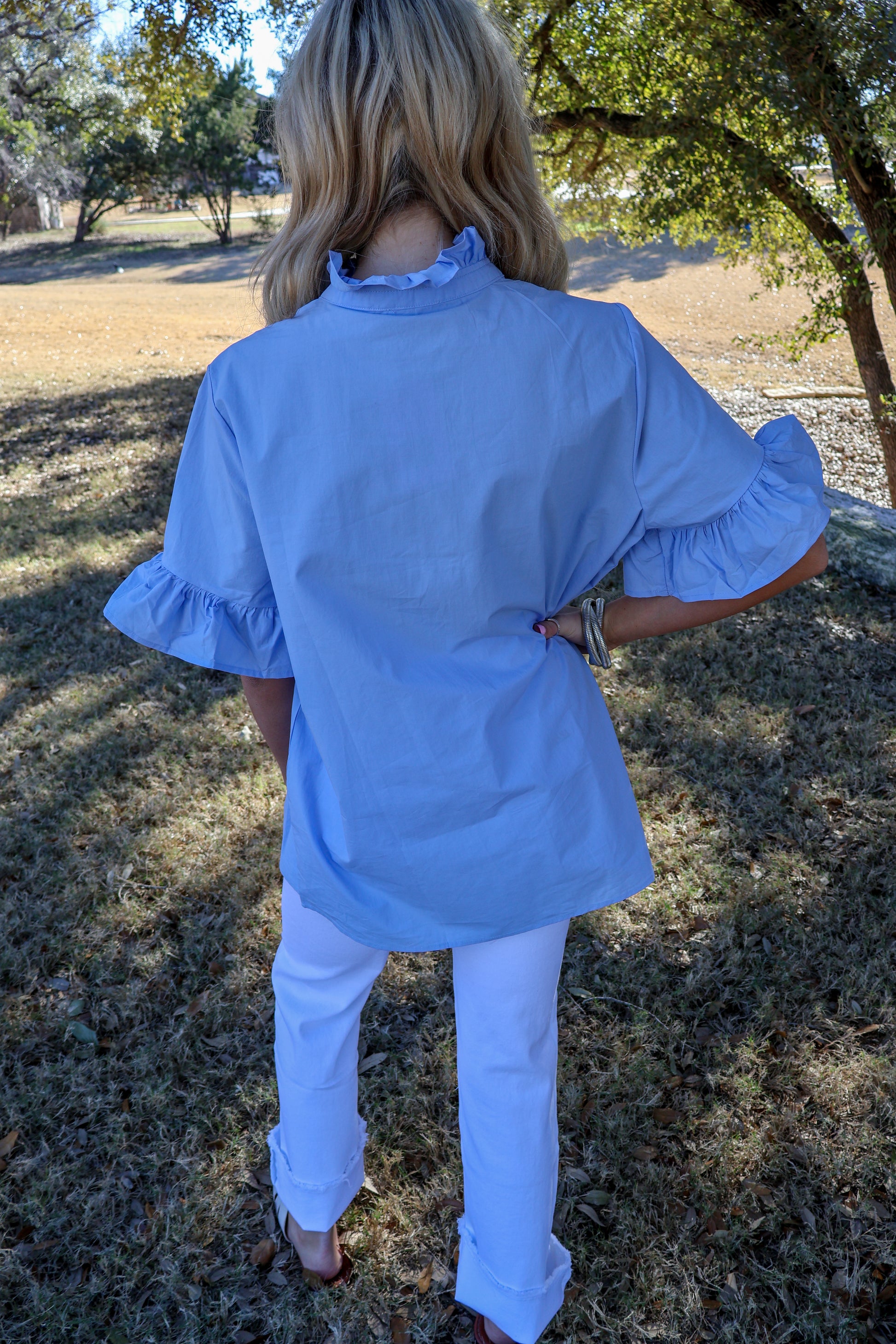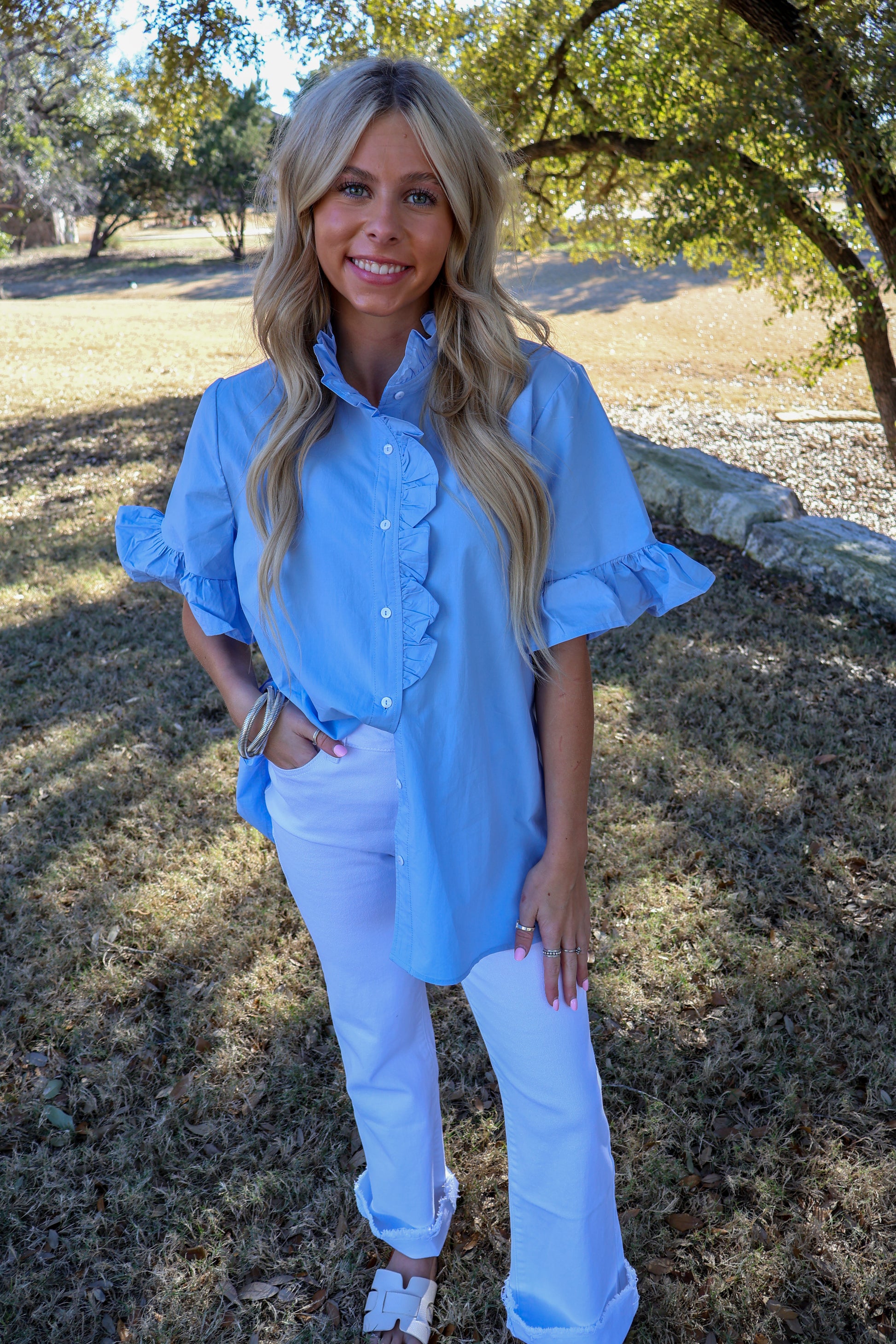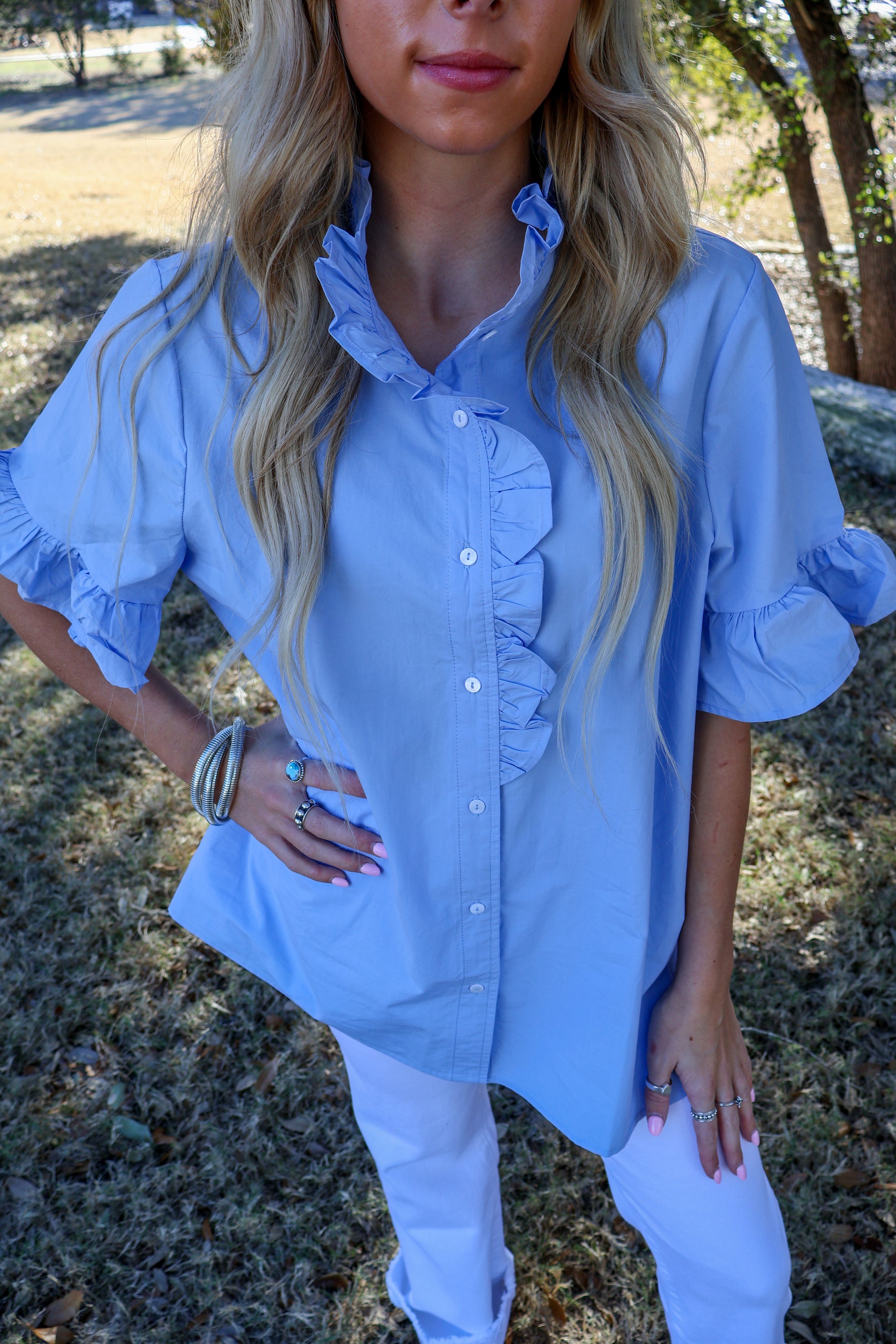 Solid color ruffled button-down short sleeve shirt