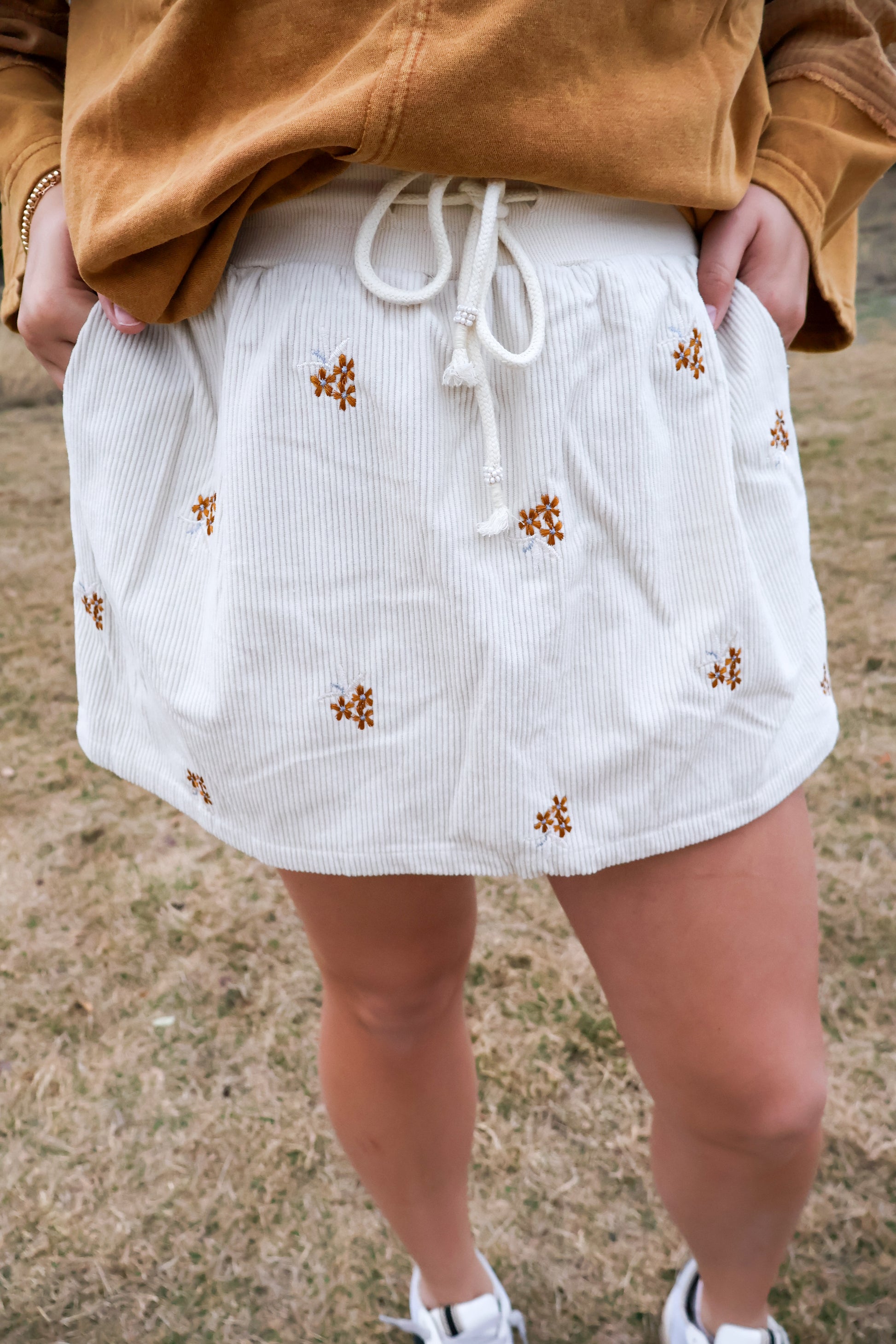 The Lainey skort combines comfort and style in soft off-white corduroy with delicate embroidered detailing. This versatile piece transitions seamlessly from casual outings to weekend adventures. The skort silhouette offers the ease of shorts with the polished look of a skirt, making it perfect for any season. Pair it with your favorite tee or blouse for an effortless, put-together look.