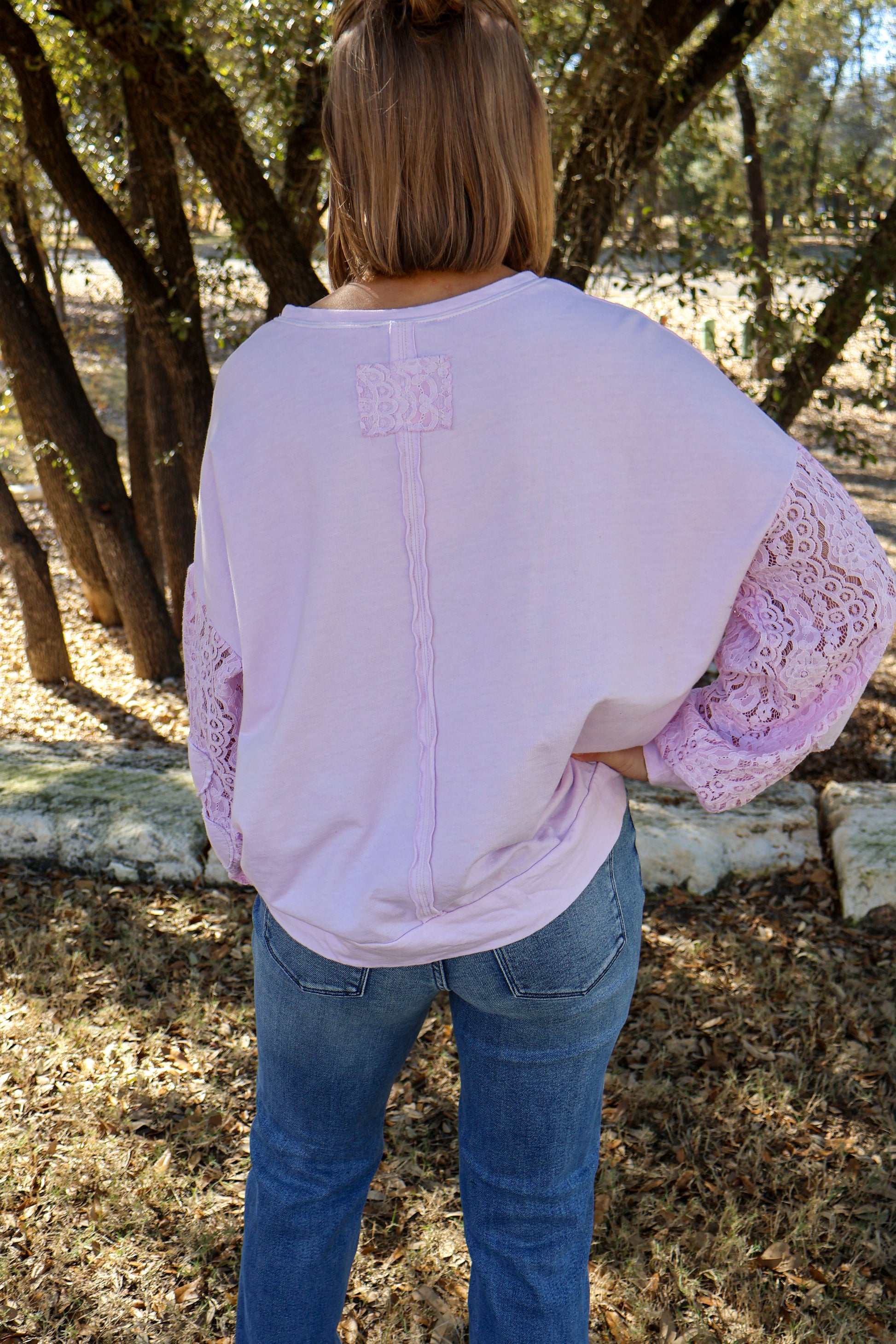 Lace mixed terry knit mineral wash pullover top