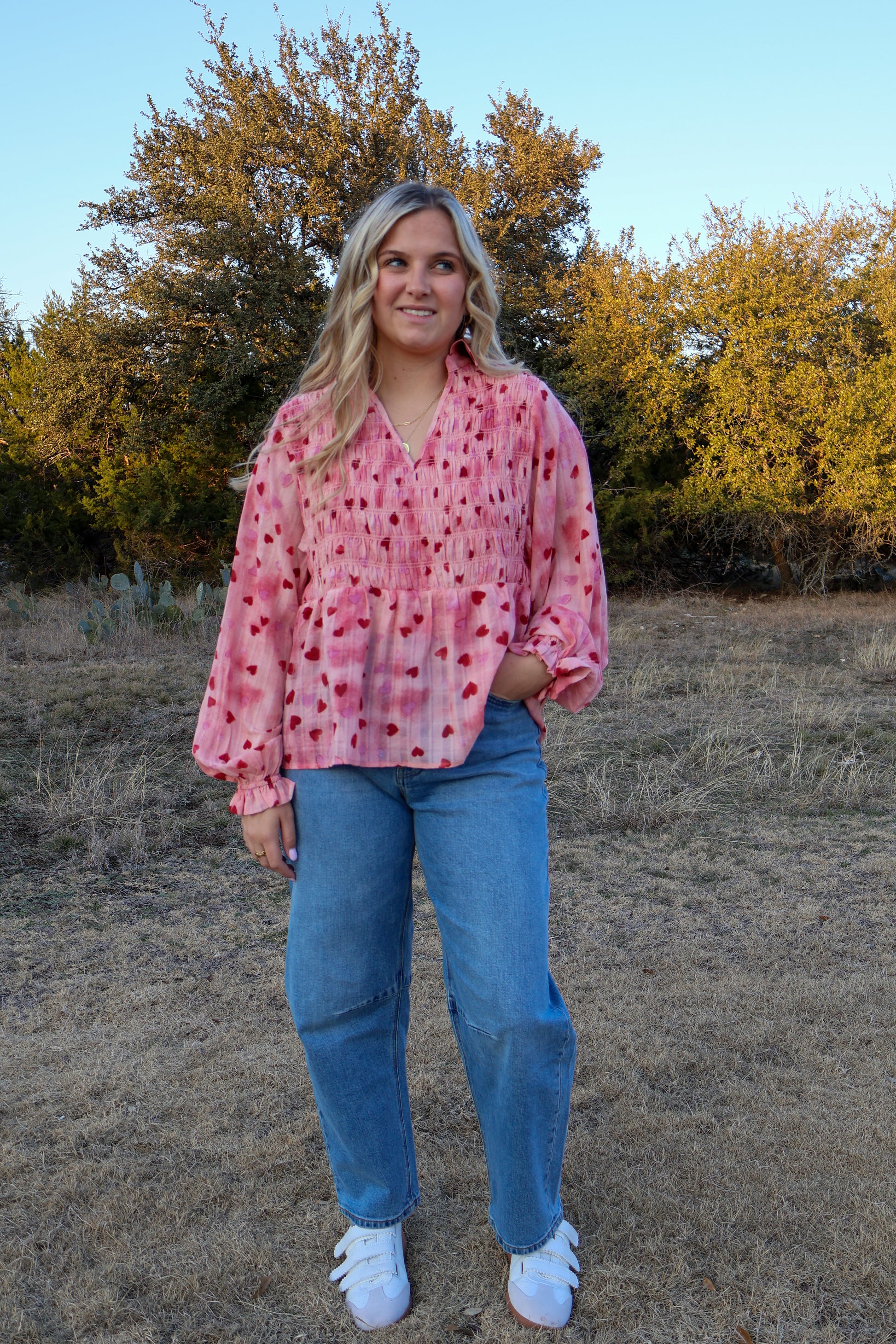 Heart printed dusty pink/red woven v-neck top with balloon sleeves