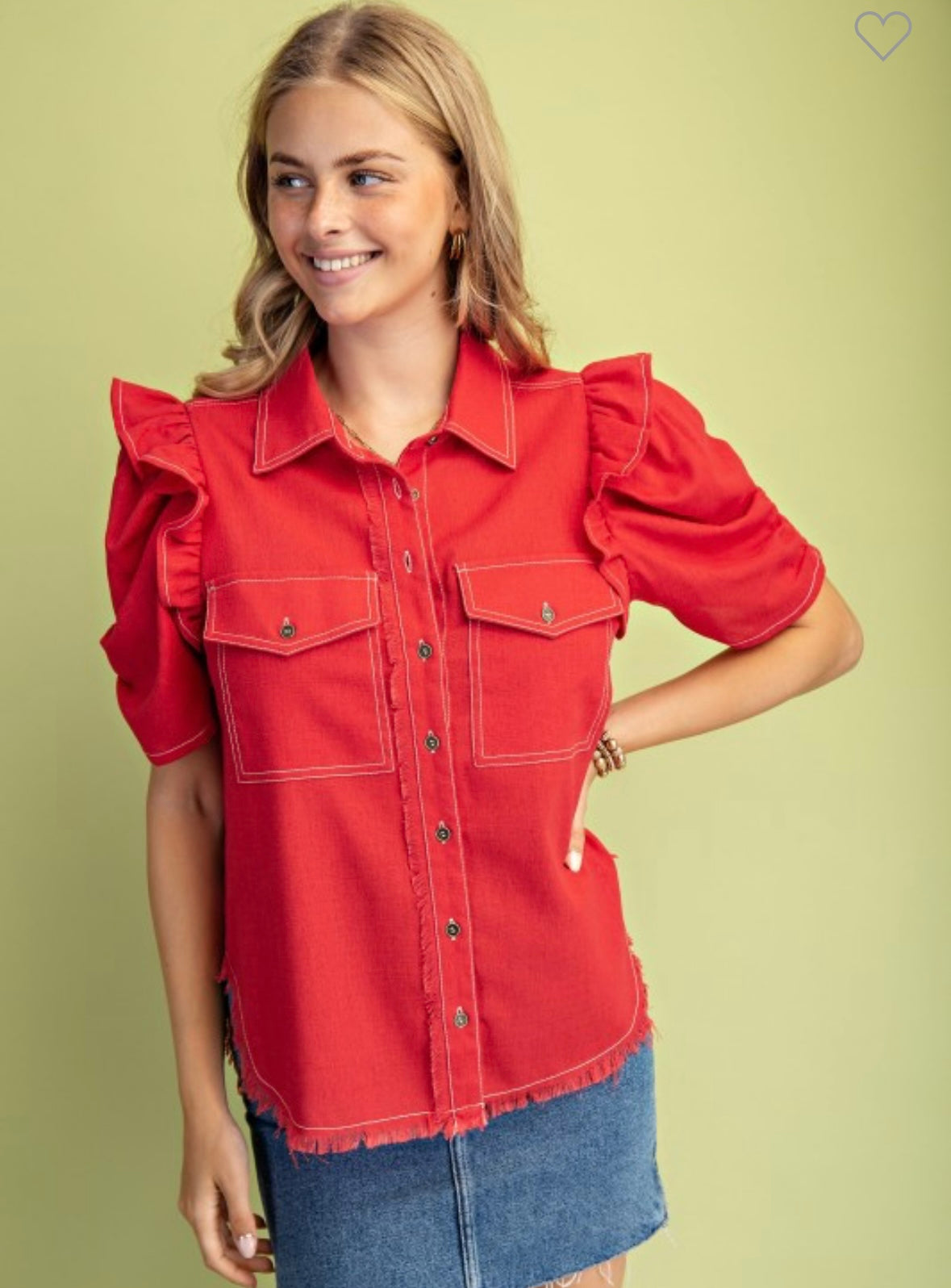 Linen button up shirt with a ruffled gathered sleeve and frayed hem details.