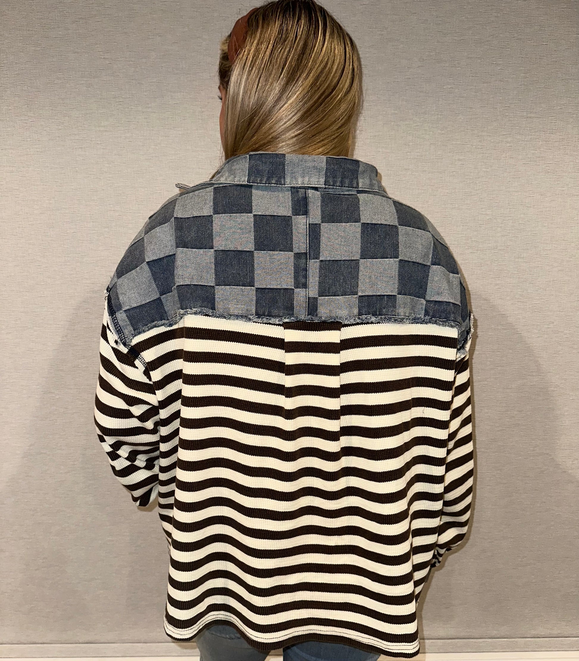 Cut edge checker denim waffle mix and match top