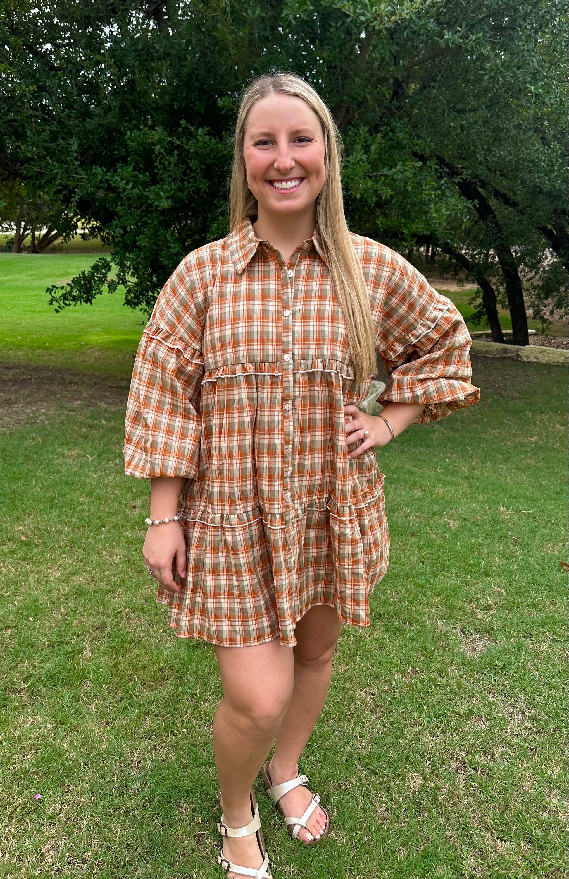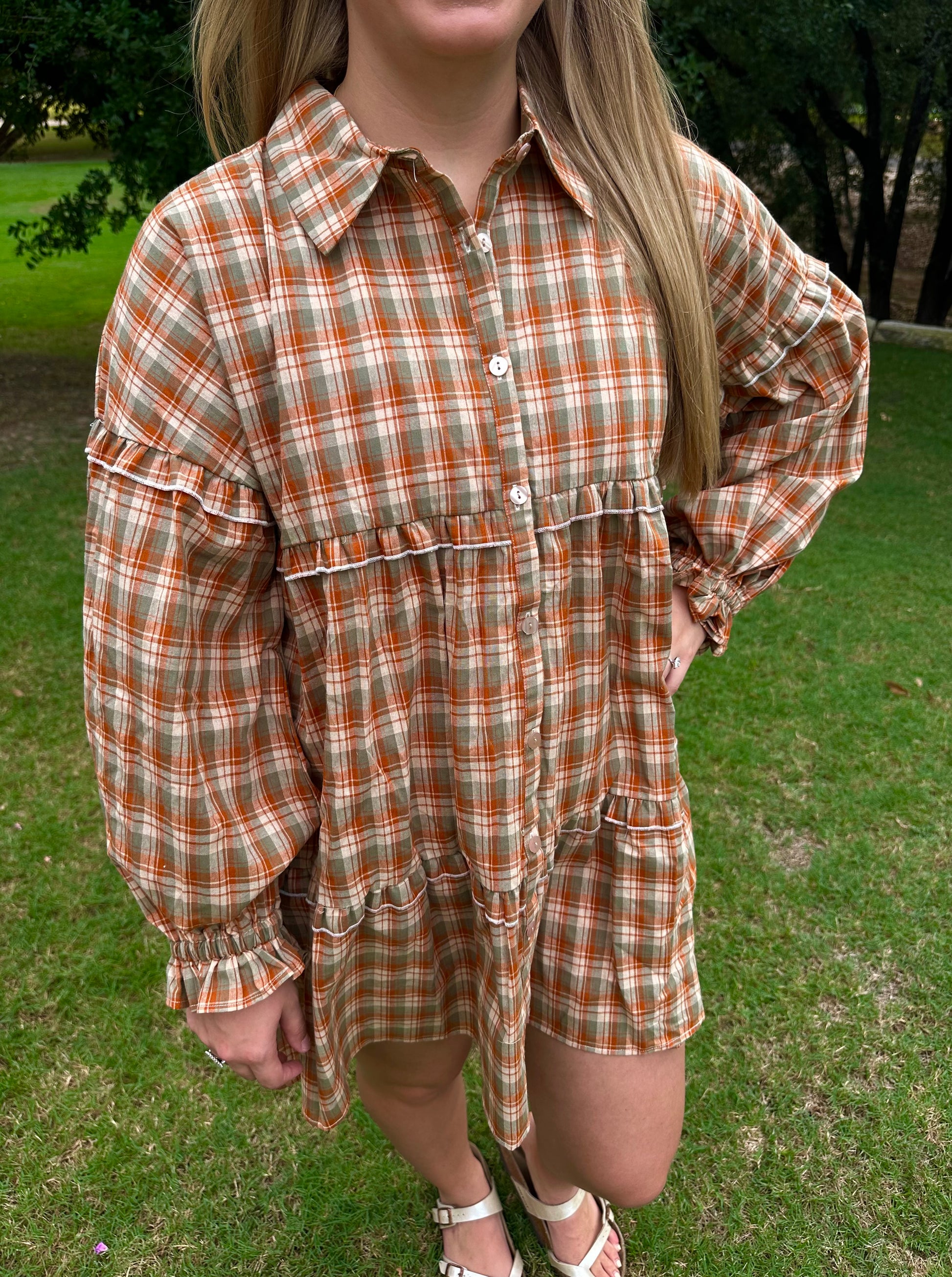 Olive and orange plaid ruffle detailed flowy fit dress