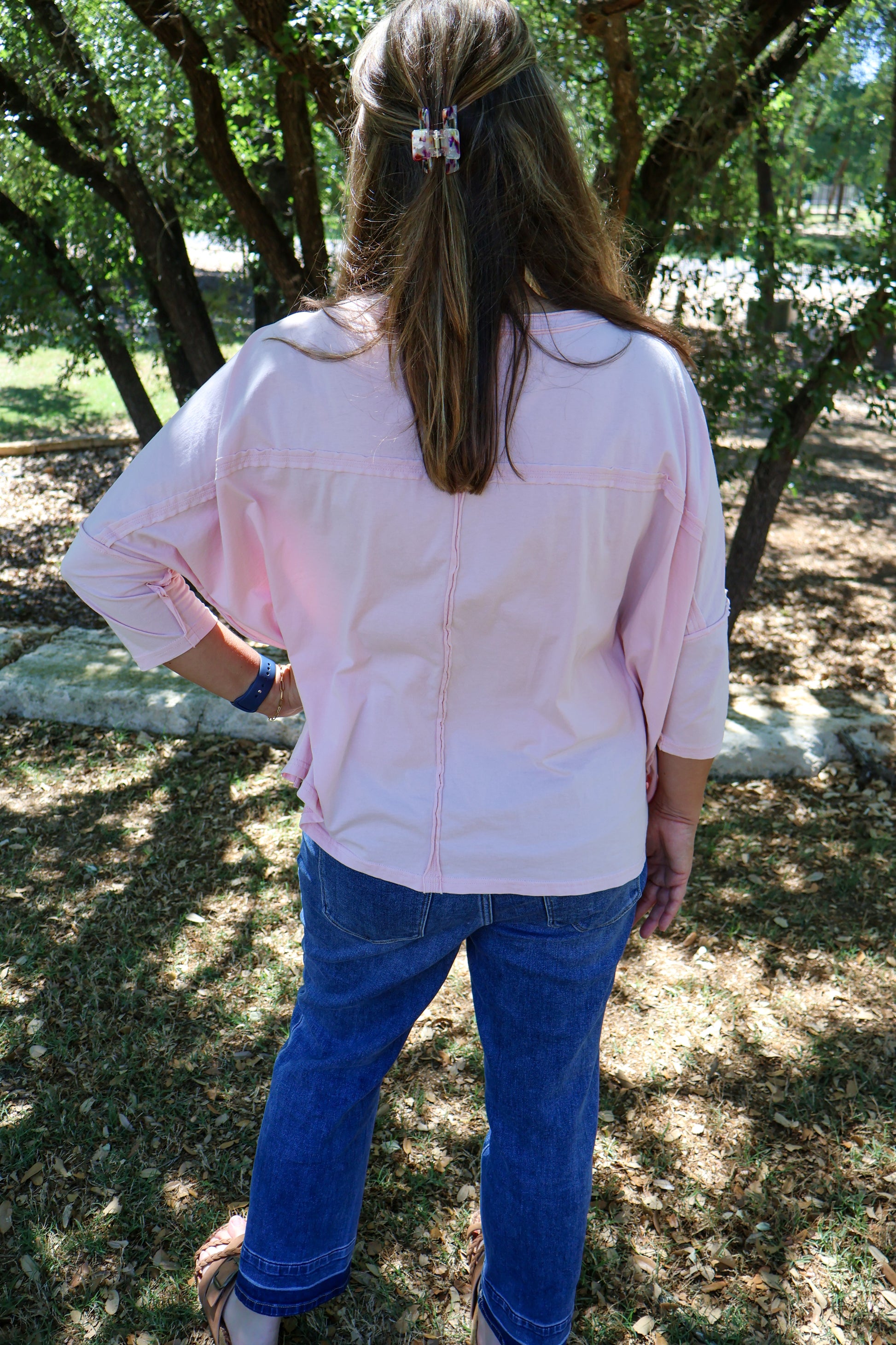 3/4 sleeved pink top with embroidered flower detail