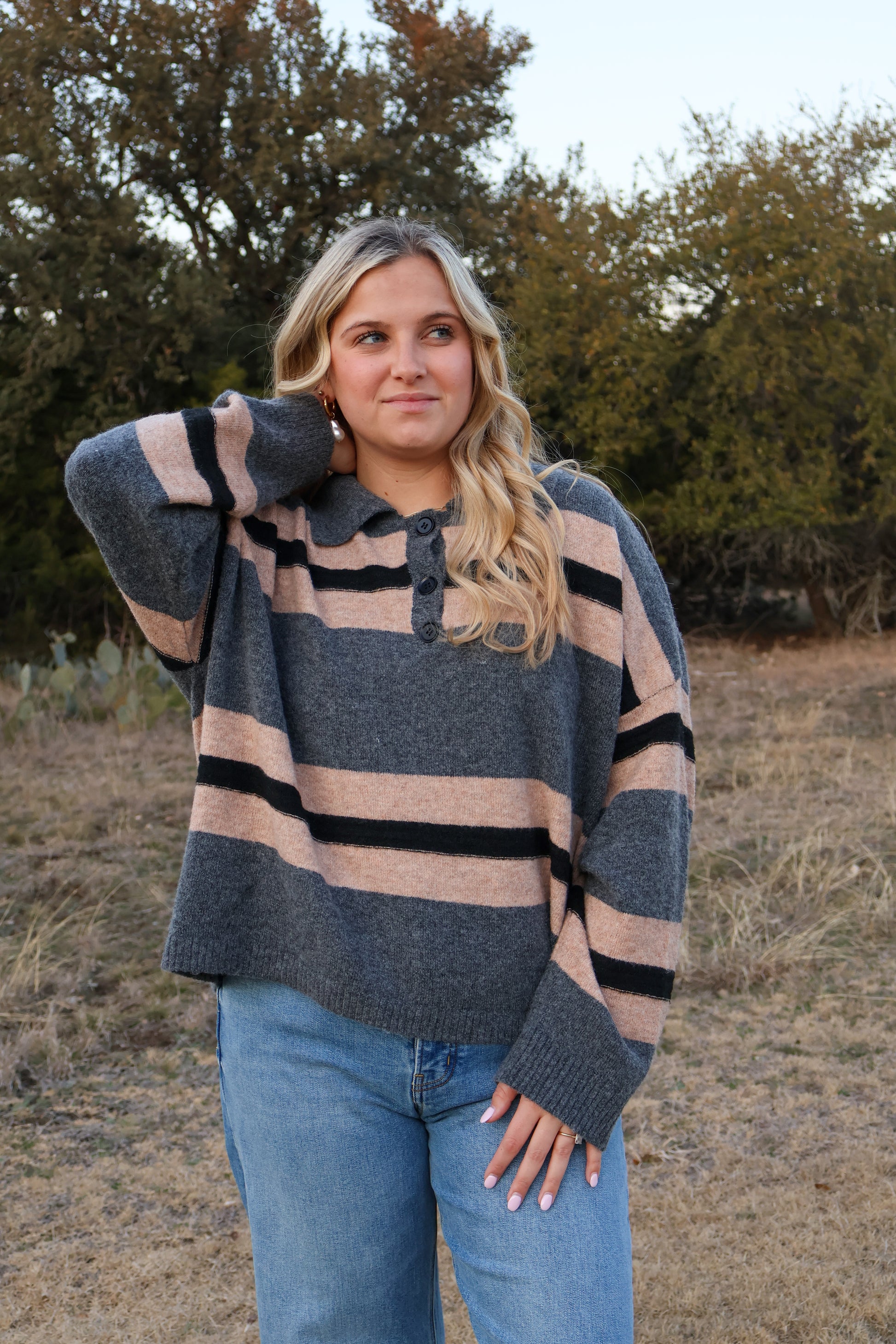 The Zinnia sweater combines comfort with understated style. This charcoal and taupe striped design features a distinctive half button detail at the neckline, adding visual interest to an otherwise classic silhouette. Perfect for layering or wearing solo, it's a versatile piece that transitions seamlessly from casual days to relaxed evenings. Soft and approachable, this sweater works with nearly everything in your wardrobe.