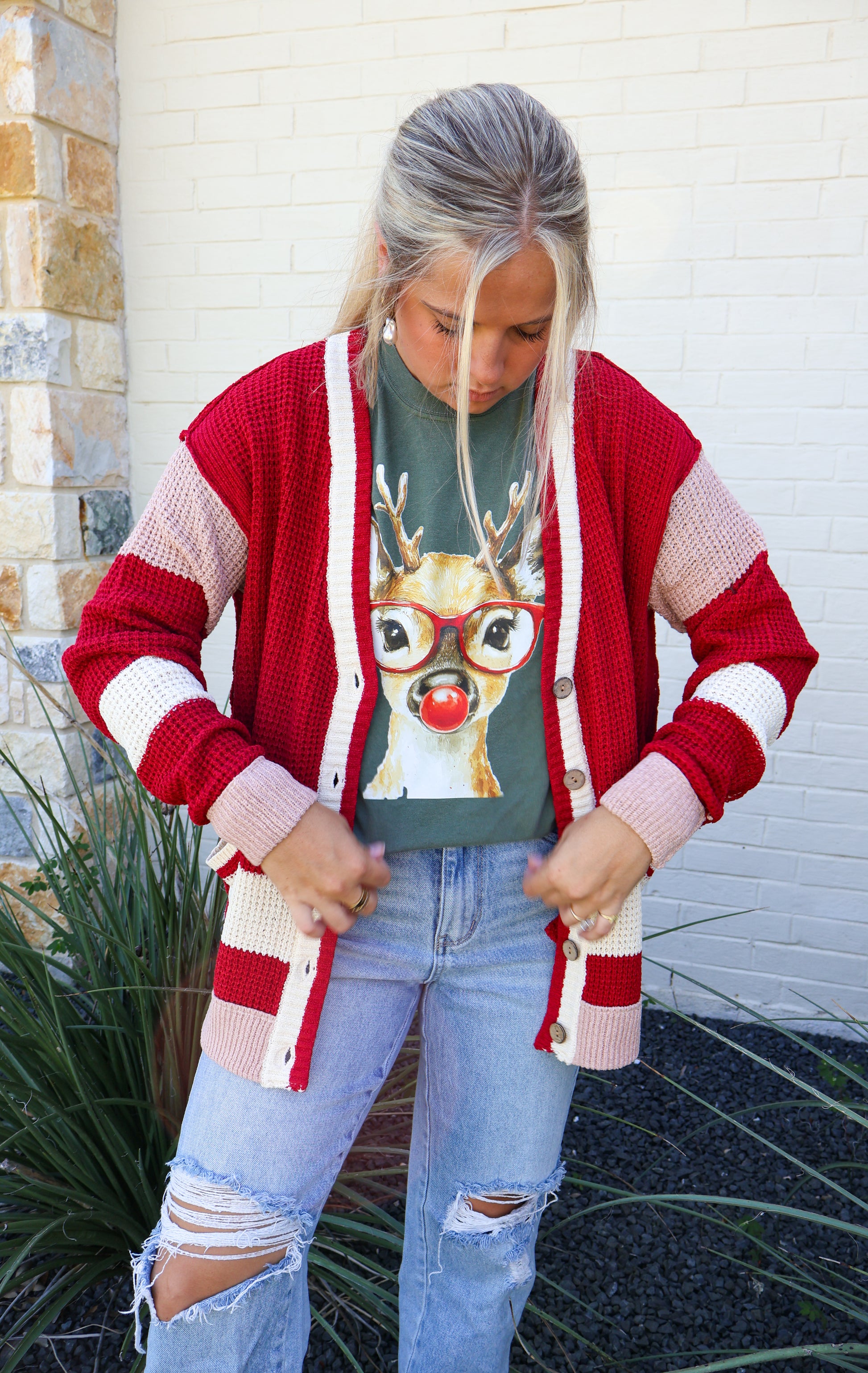 This vintage-style tee features a playful graphic of Rudolph the Reindeer wearing bright red glasses. Made for comfort and casual wear, it adds a fun, festive touch to your wardrobe perfect for the holiday season.